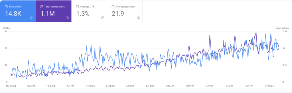 Crecimiento del sitio en Google en el último año. Fuente: Google Search Console